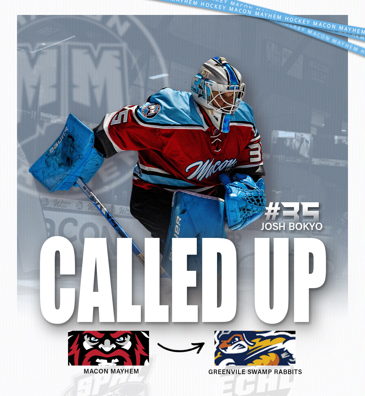 (MACON, Ga.) – The Macon Mayhem, proud members of the SPHL, announced Wednesday that goaltender Josh Boyko has been called up by the ECHL’s Greenville Swamp Rabbits.